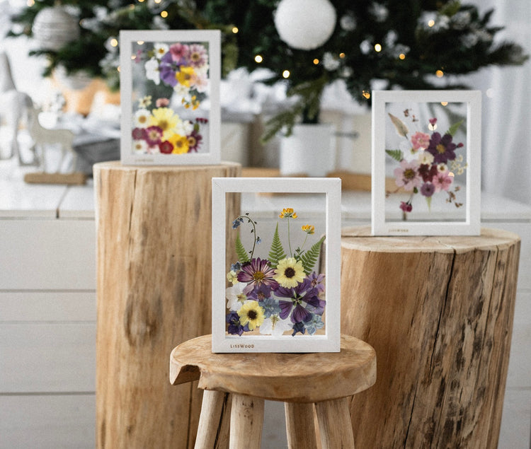 Wir erstellen Blumen- und Waldbilder , die wir in handgefertigten Holzrahmen aufbewahren.
