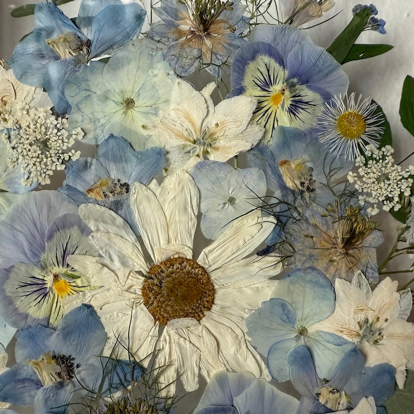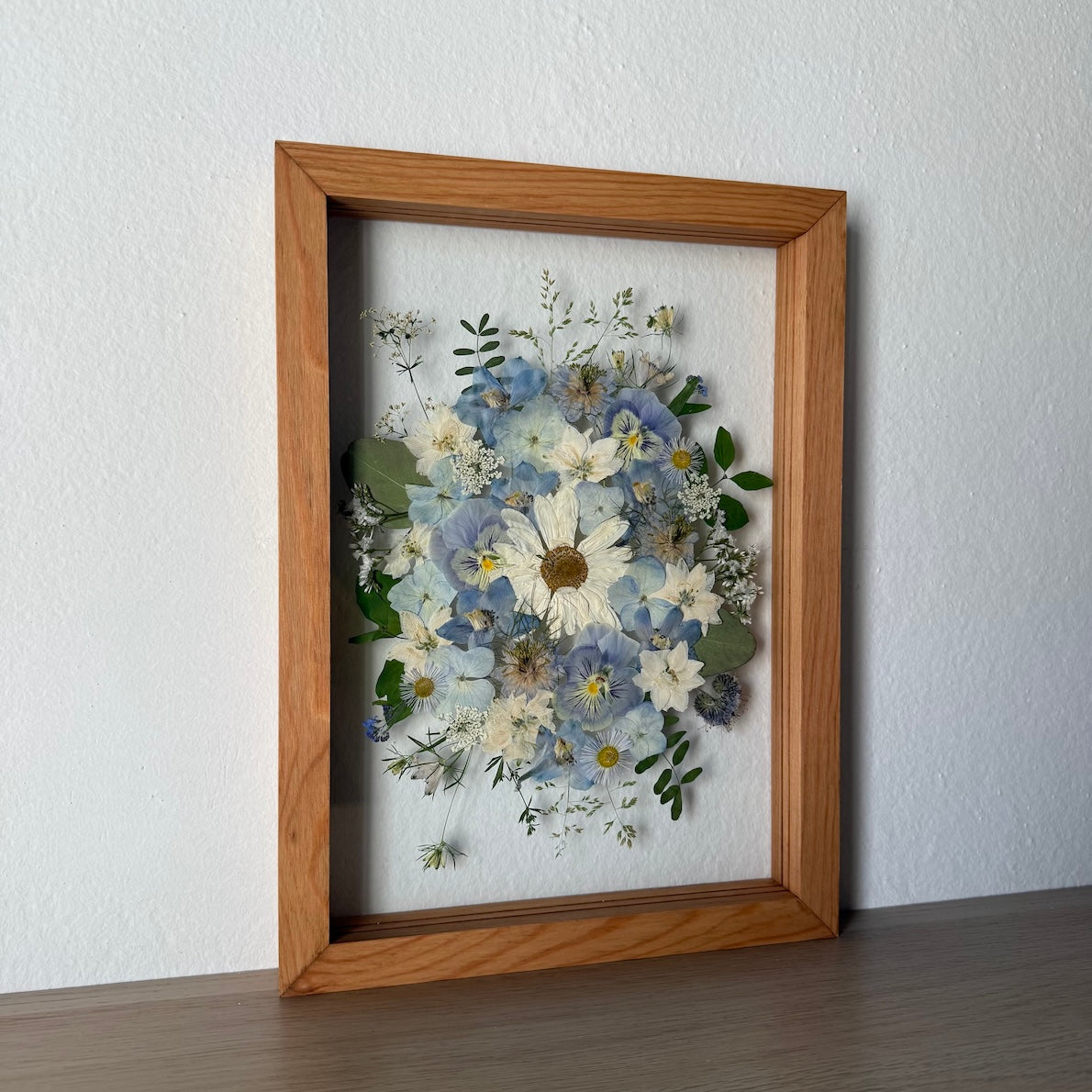 Handgemachtes Blumengemälde mit Blumen in Blau und Weiß, die aus den Ecken des Gemäldes wachsen. Unter den Blumen finden Sie Wolfsmilch, Hortensien, Kornblumen und vieles mehr.