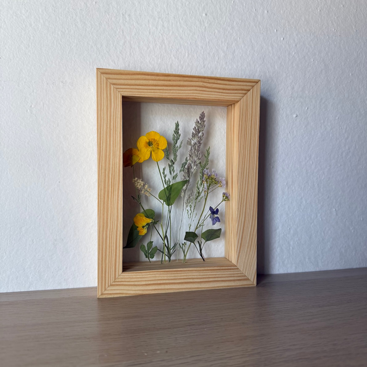 Ein handgefertigtes Blumenwiesengemälde mit Blumen in Gelb, Blau und Weiß, die aus der Unterseite des Gemäldes wachsen. Unter den Blumen finden Sie Gänseblümchen, Kornblumen und andere.