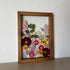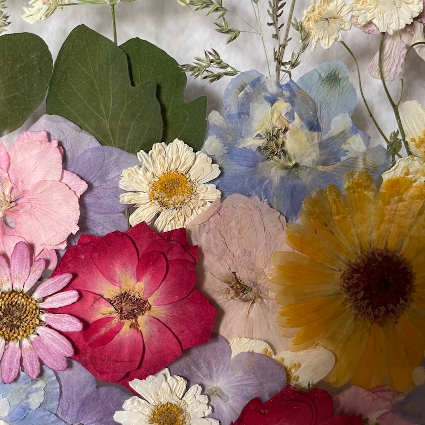 Handgemachtes Blumengemälde mit Blumen in Rosa, Blau und Gelb, die aus der Mitte des Gemäldes wachsen. Unter den Blumen finden Sie Wolfsmilch, Hortensien, Chrysanthemen und vieles mehr.