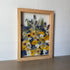 Handgemachtes Blumengemälde mit Blumen in Blau und Weiß, die aus den Ecken des Gemäldes wachsen. Unter den Blumen finden Sie Wolfsmilch, Hortensien, Kornblumen und vieles mehr.