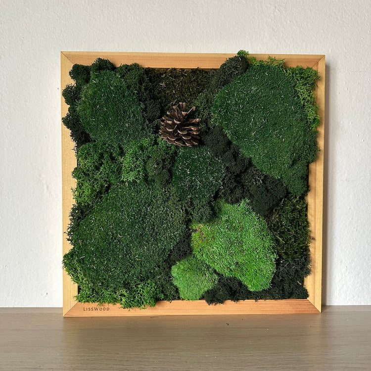 Handgefertigtes Gemälde mit flauschigen Büscheln verschiedener Moosarten.