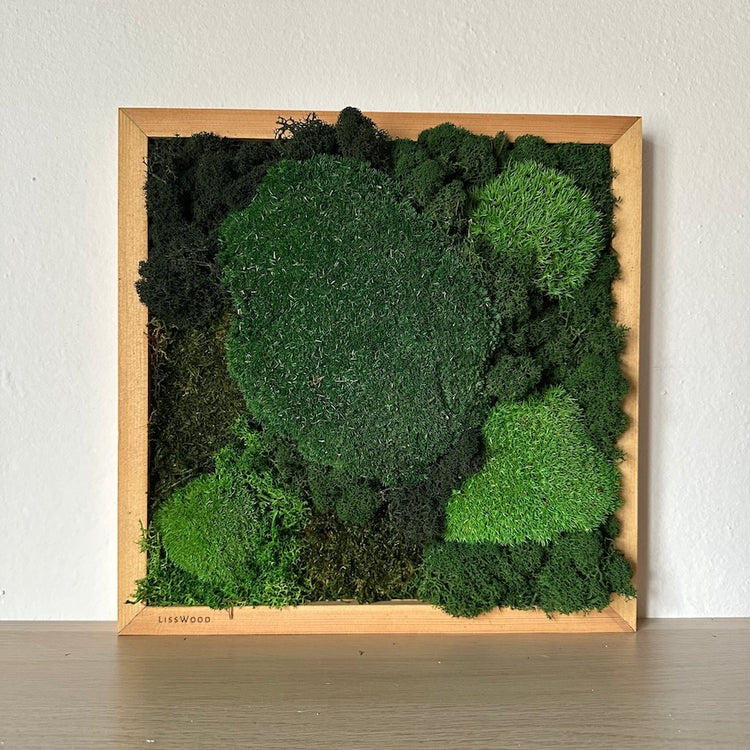 Handgefertigtes Gemälde mit flauschigen Büscheln verschiedener Moosarten.