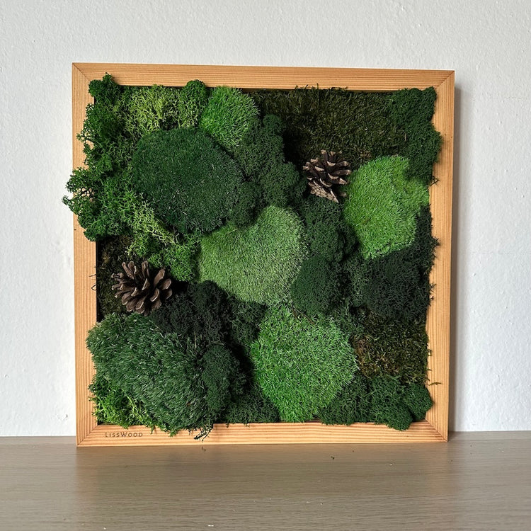 Handgefertigtes Gemälde mit flauschigen Büscheln verschiedener Moosarten.