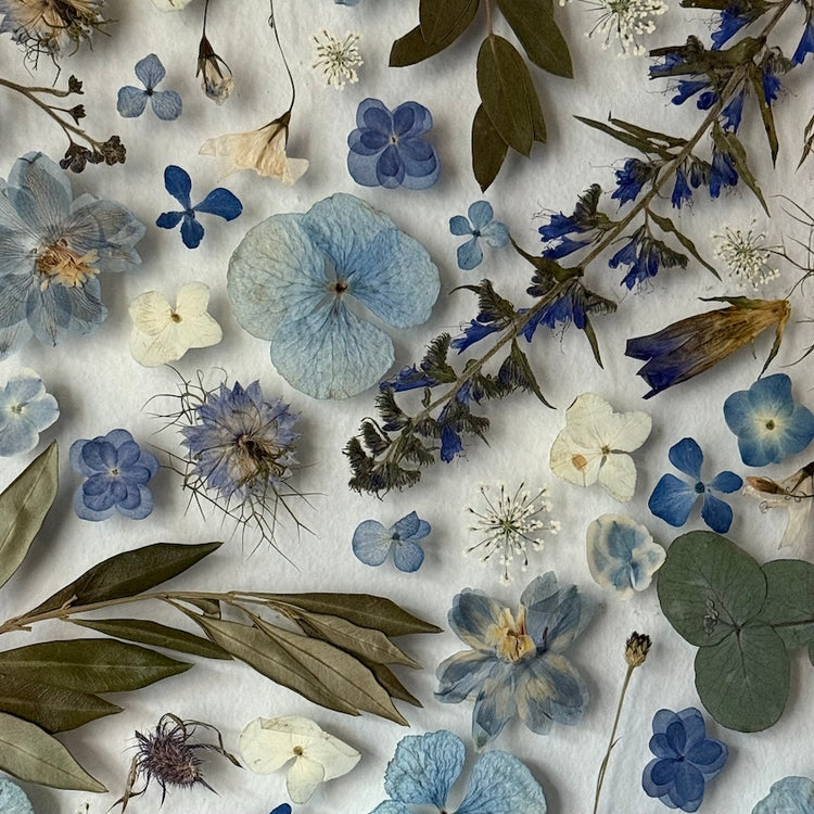 Handgemachtes Blumengemälde mit Blumen in Blau- und Weißtönen, die durch das gesamte Gemälde wachsen. Unter den Blumen finden Sie Hortensien, Krokusse, Stiefmütterchen und vieles mehr.