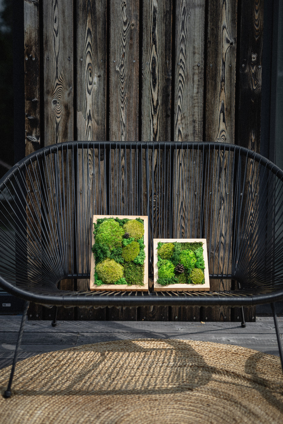 The previous collection is about ferns, but this one is full of moss. Green, fluffy, with a pine cone or a twig, this is our moss in a handmade wooden frame.