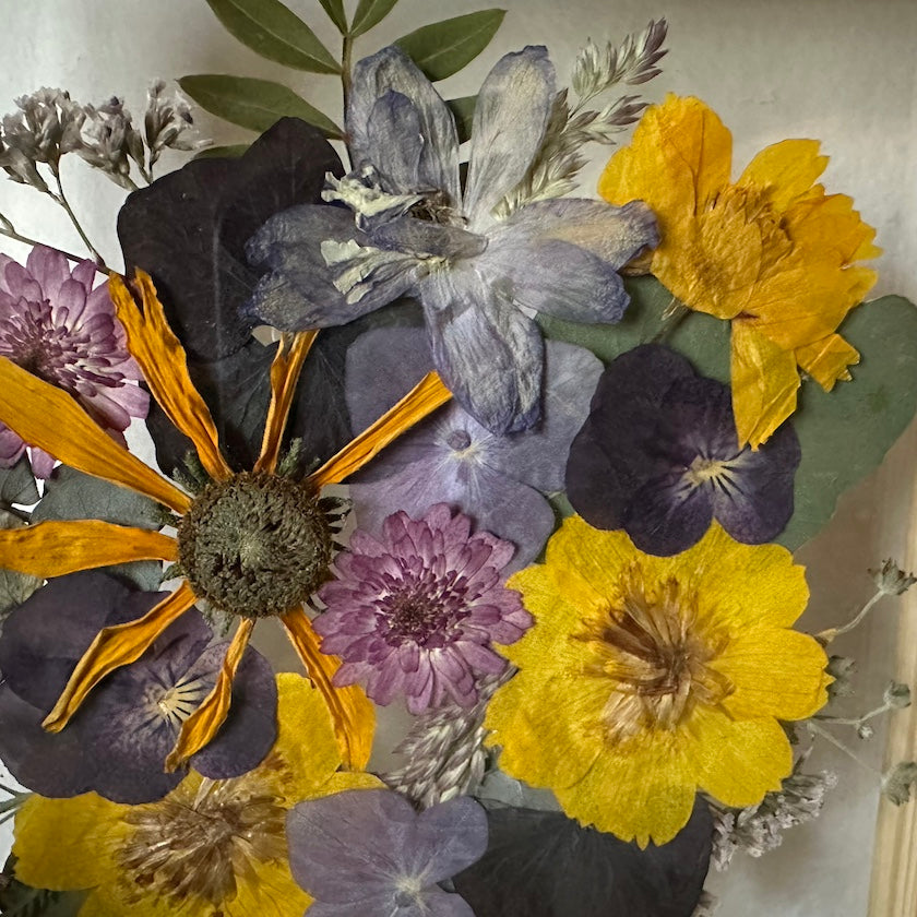 Ein handgefertigtes Blumengemälde mit Blumen in Gelb, Blau und Lila, die aus der Mitte des Gemäldes wachsen . Unter den Blumen finden Sie Chrysanthemen, Hortensien und vieles mehr.