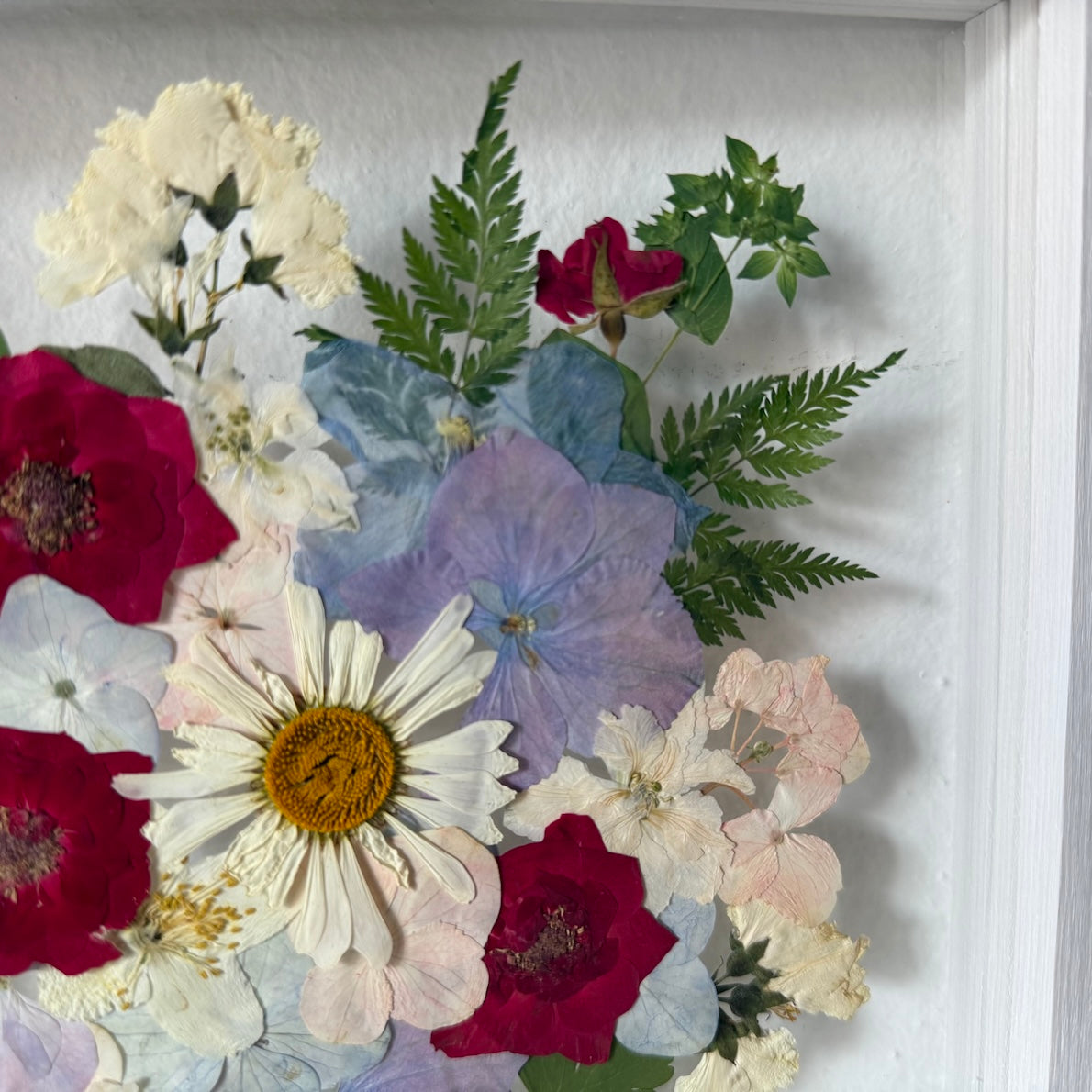 Handgemachtes Blumengemälde mit Blumen in Blau-, Rosa- und Lilatönen, die aus der Mitte des Gemäldes wachsen. Unter den Blumen finden Sie Kirschblüten, Hortensien, Wolfsmilch und vieles mehr.