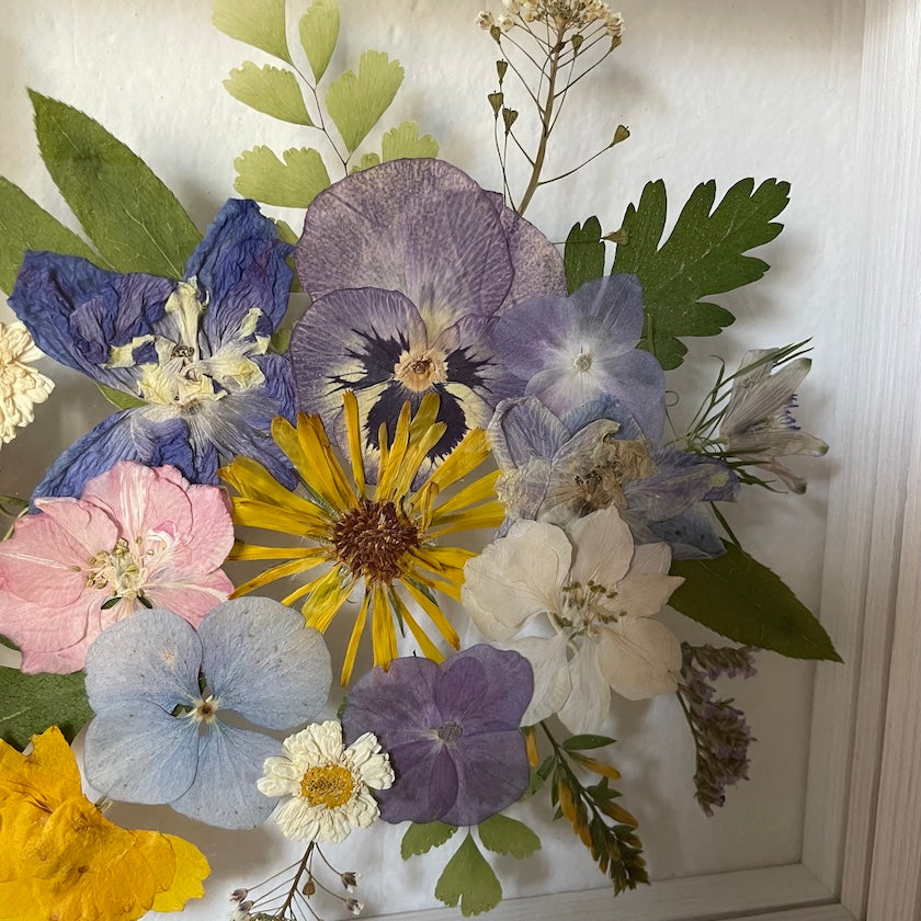 Handgemachtes Blumengemälde mit blauen und weißen Blumen, die aus den Ecken des Gemäldes wachsen. Unter den Blumen finden Sie Hortensien, Stiefmütterchen, Wolfsmilch und vieles mehr.