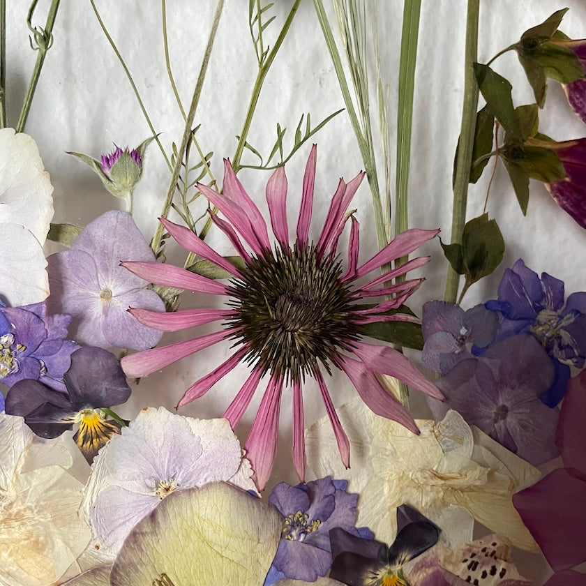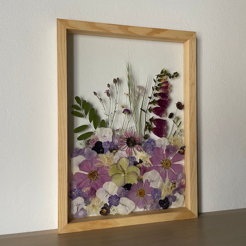 Handgemachtes Blumengemälde mit Blumen in Rosa, Lila und Weiß, die aus der Unterseite des Gemäldes wachsen. Unter den Blumen finden Sie Krokusse, Gänseblümchen, Rosen und vieles mehr.