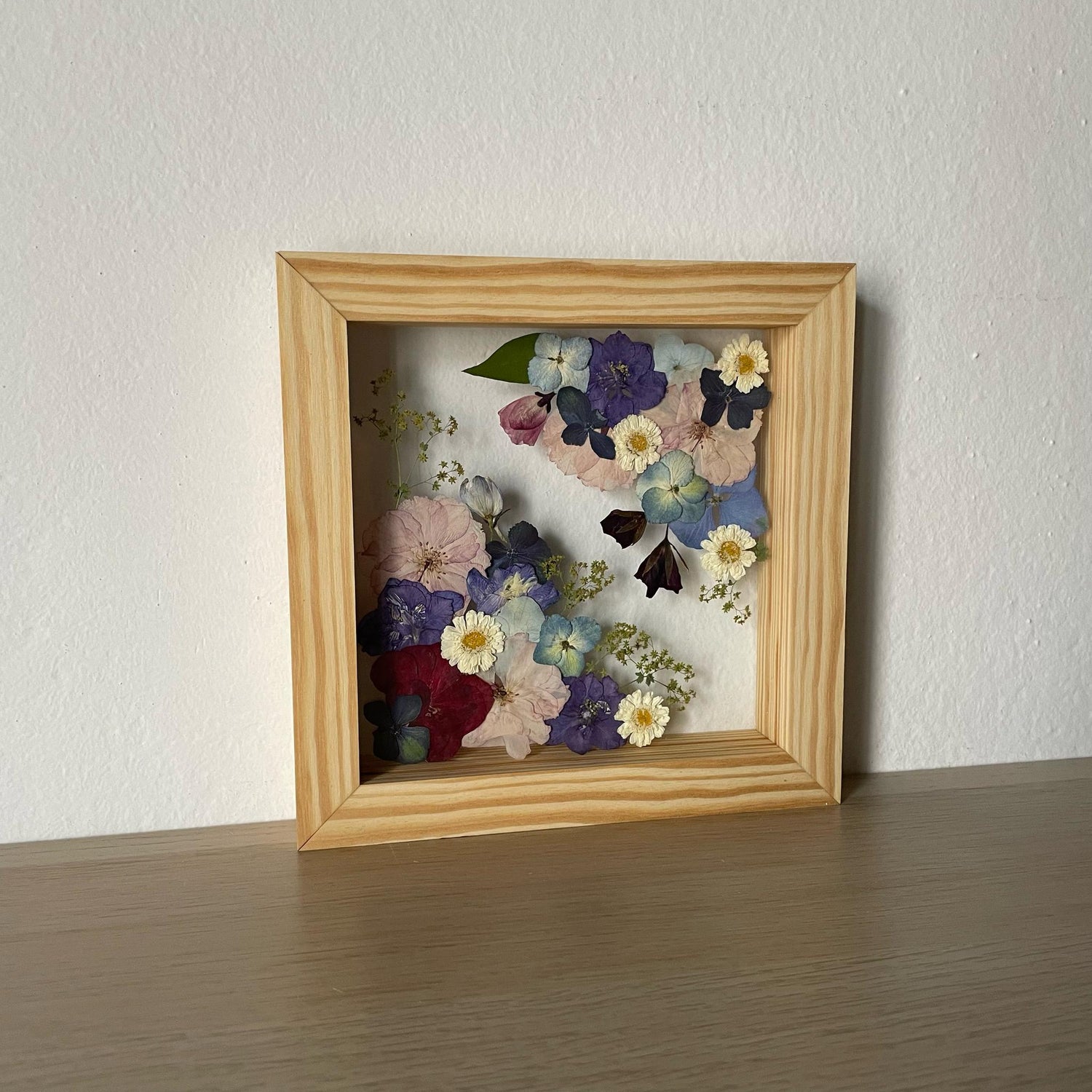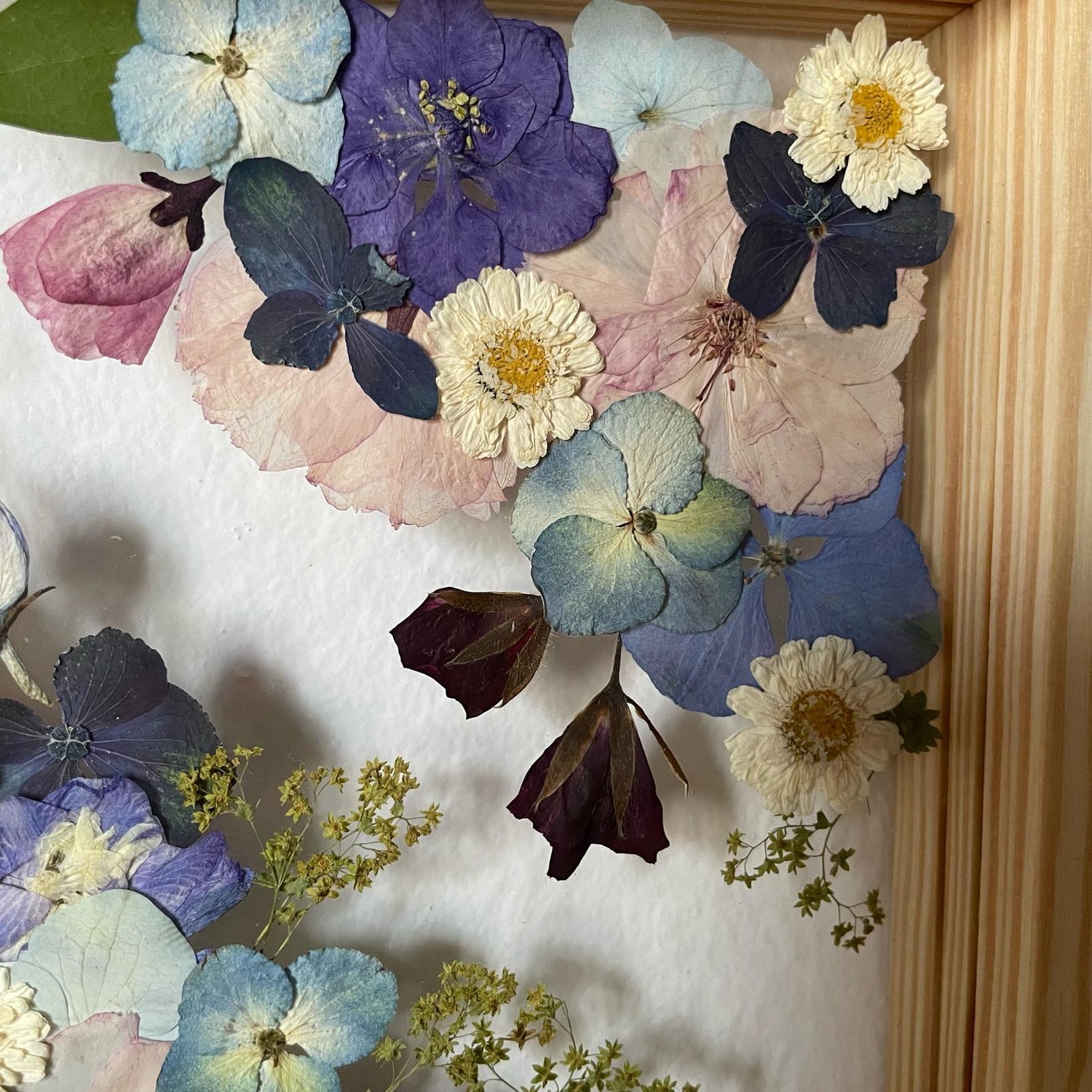 Handgemachtes Blumengemälde mit blauen und weißen Blumen, die aus den Ecken des Gemäldes wachsen. Unter den Blumen finden Sie Hortensien, Stiefmütterchen, Wolfsmilch und vieles mehr.