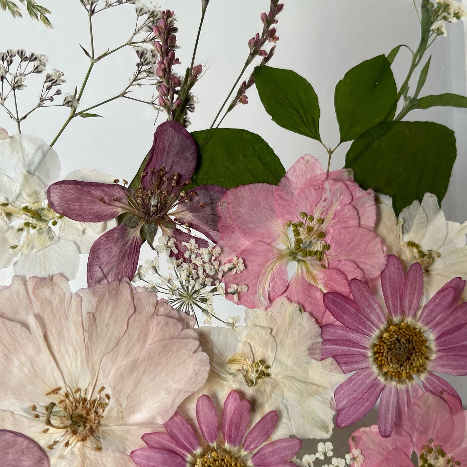 Handgemachtes Blumengemälde mit rosa und weißen Blumen, die überall im Gemälde wachsen. Unter den Blumen finden Sie Rosen, Chrysanthemen, Gänseblümchen und vieles mehr.