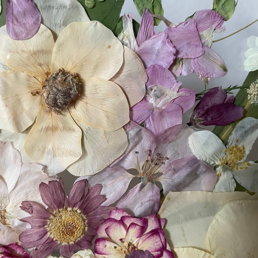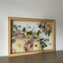Handgefertigtes Blumengemälde mit Blumen in Rosa-, Gelb- und Weißtönen, die aus der Unterseite des Gemäldes wachsen. Unter den Blumen finden Sie Rosen, Gänseblümchen, Hortensien, Stiefmütterchen und vieles mehr.