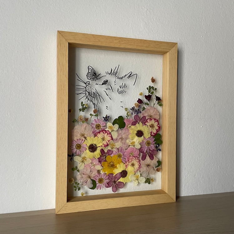 Handgemachtes Blumengemälde mit einer handgezeichneten Tiersilhouette. Ein Hund auf einer blühenden Wiese aus echten Blumen erwärmt das Herz eines jeden Liebhabers der Tier- und Blumenwelt. Für Klein und Groß.