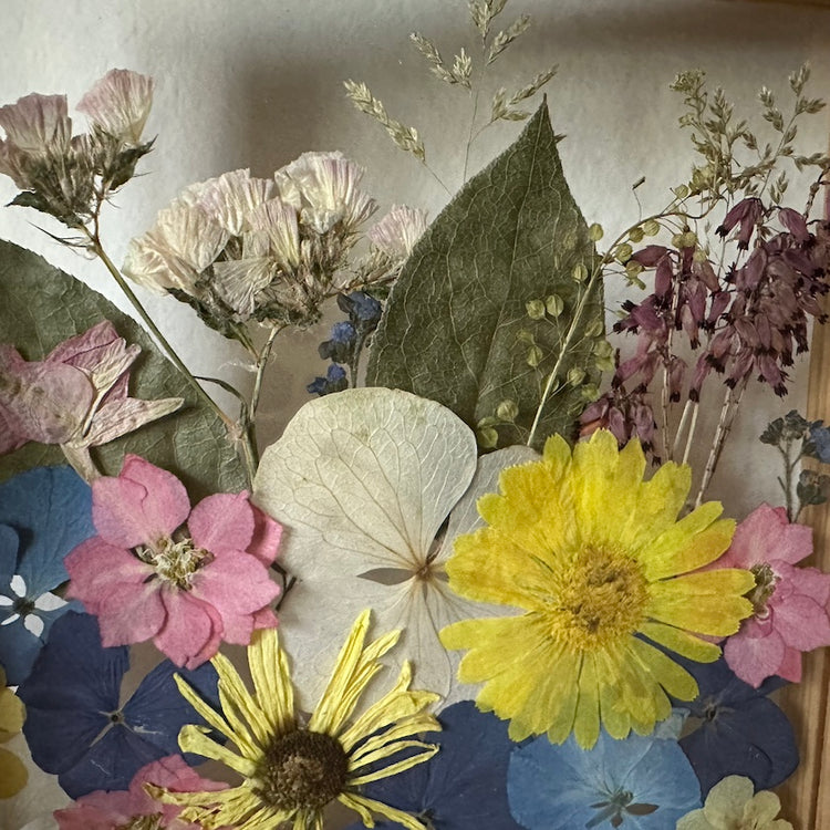 Handgefertigtes Blumengemälde mit Blumen in Gelb, Rosa und Blau, die aus der Unterseite des Gemäldes wachsen . Unter den Blumen finden Sie Hortensien, Chrysanthemen, Wolfsmilch und vieles mehr.