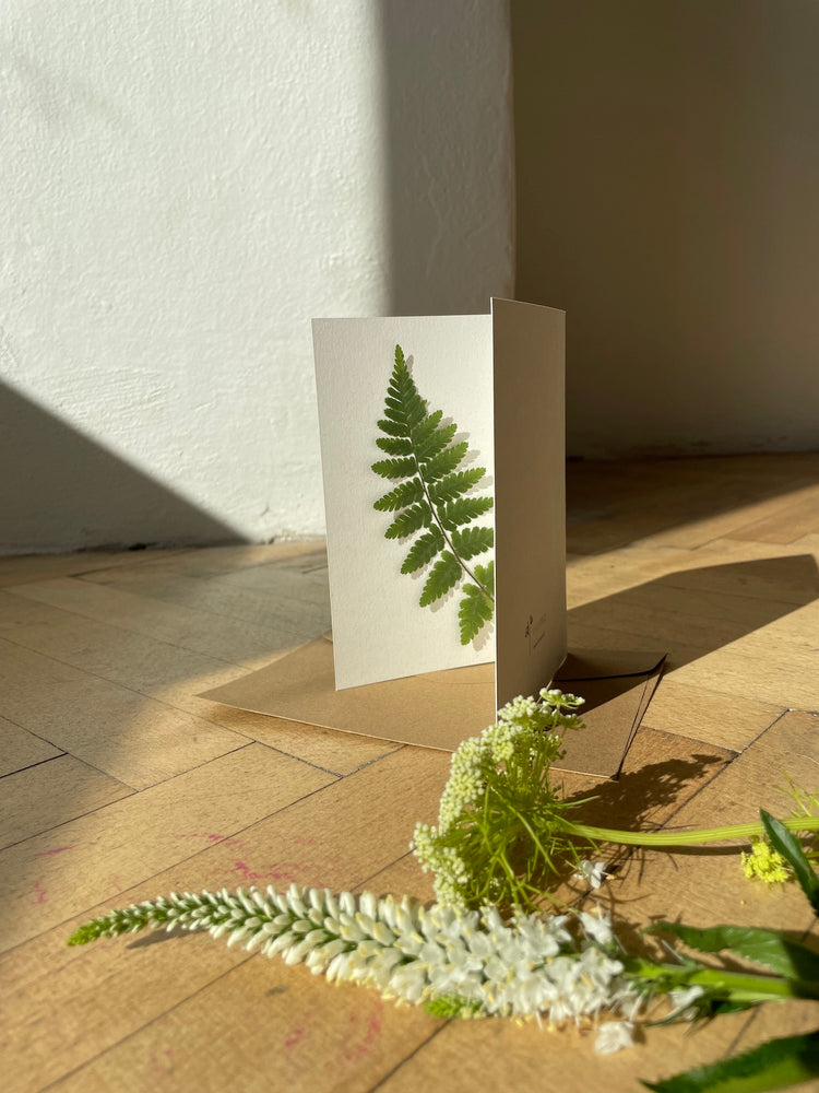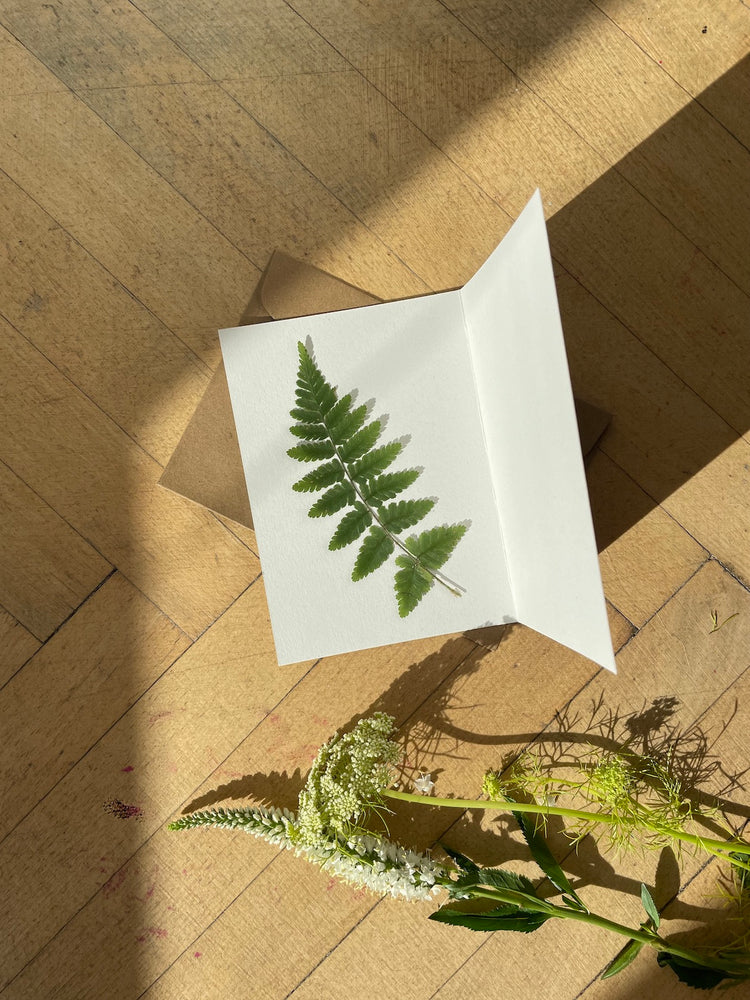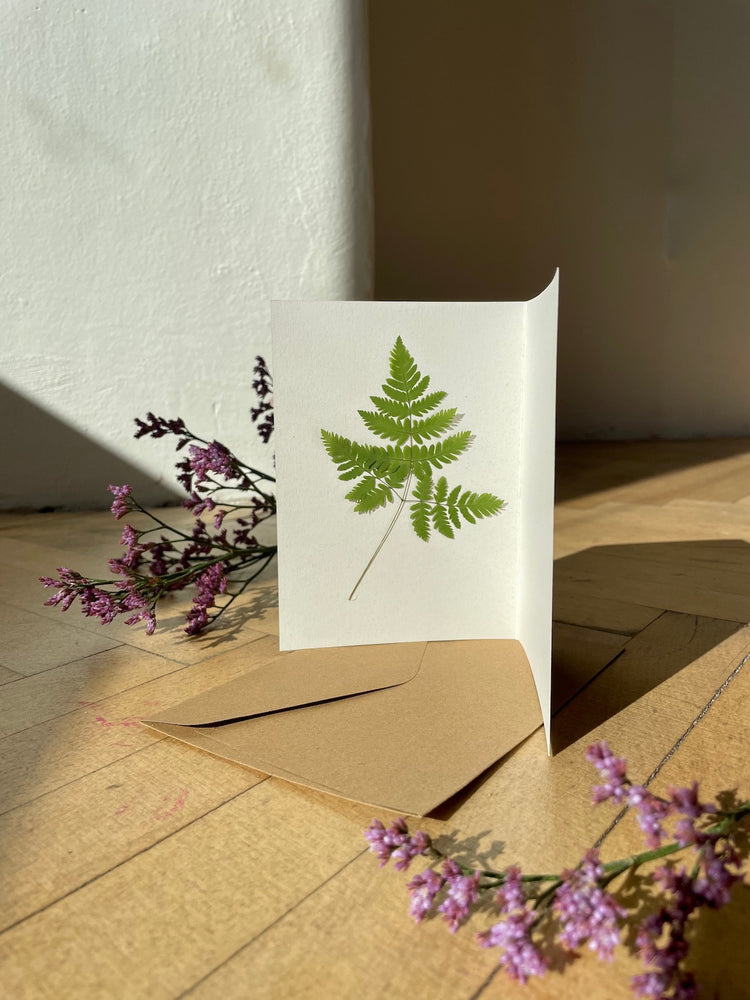 Delight your loved ones with a floral card featuring a real pressed fern placed inside a card made of natural hard paper. Both the front and back halves of the card are clear for writing a heartfelt message. Ferns can be of different types. Give it as a gift with a painting or just as it is. ❤️