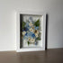 Handgemachtes Blumengemälde mit Blumen in Blau, Gelb und Weiß, die über das gesamte Gemälde wachsen. Unter den Blumen finden Sie Hortensien, Margeriten, Gänseblümchen und vieles mehr.