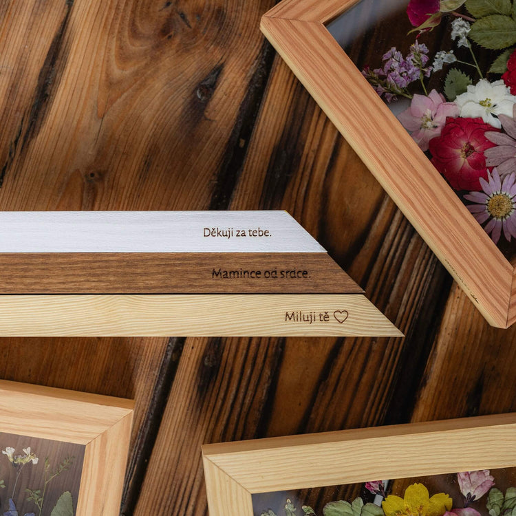 Lassen Sie Ihren Wunschtext von uns auf den Bilderrahmen brennen. Es kann eine Widmung, ein Zitat oder auch eine Liebeserklärung sein.