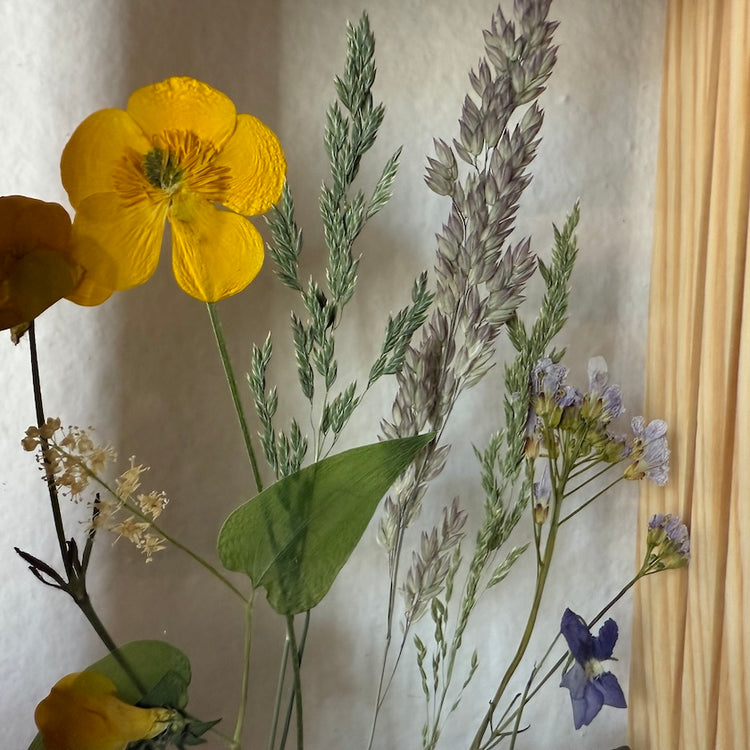 Ein handgefertigtes Blumenwiesengemälde mit Blumen in Gelb, Blau und Weiß, die aus der Unterseite des Gemäldes wachsen. Unter den Blumen finden Sie Gänseblümchen, Kornblumen und andere.