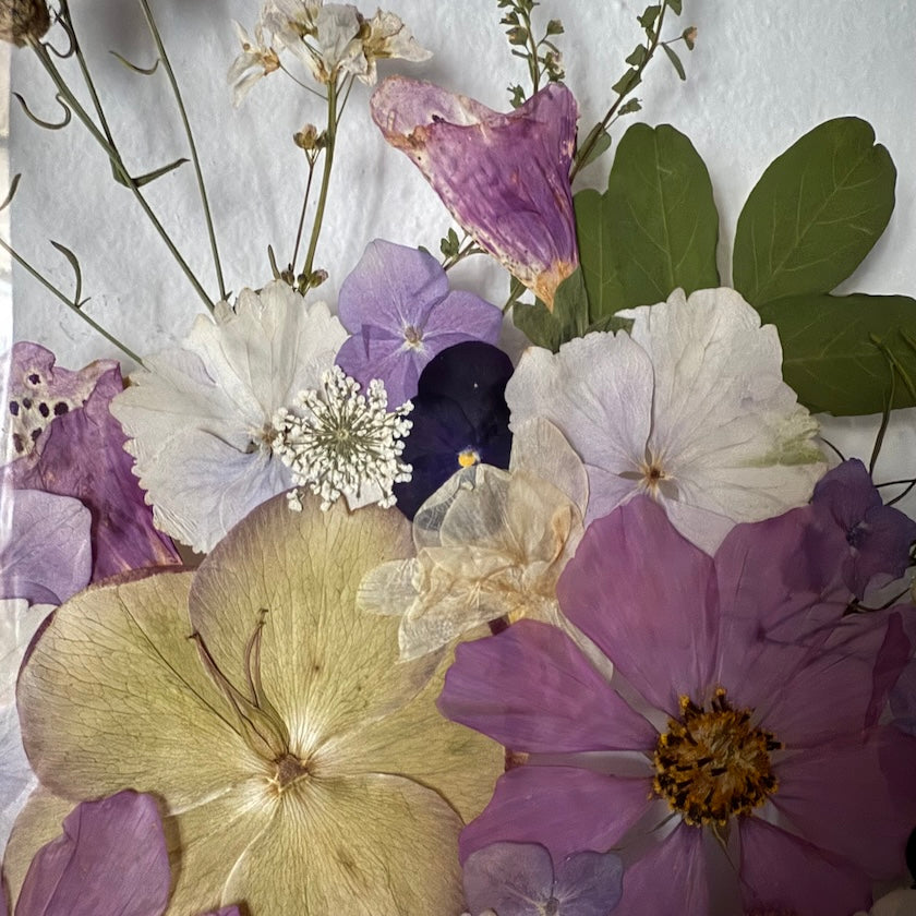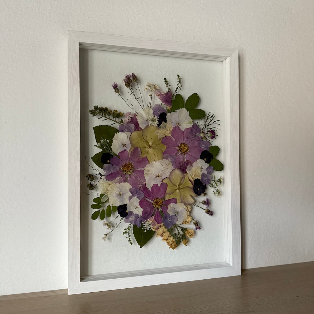 Handgemachtes Blumengemälde mit Blumen in Rosa, Lila und Weiß, die aus der Unterseite des Gemäldes wachsen. Unter den Blumen finden Sie Krokusse, Gänseblümchen, Rosen und vieles mehr.