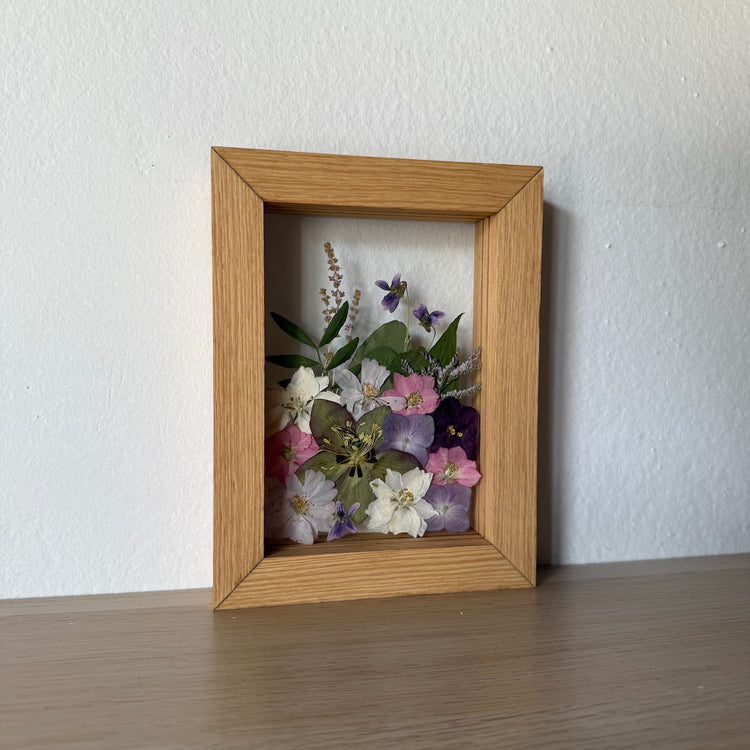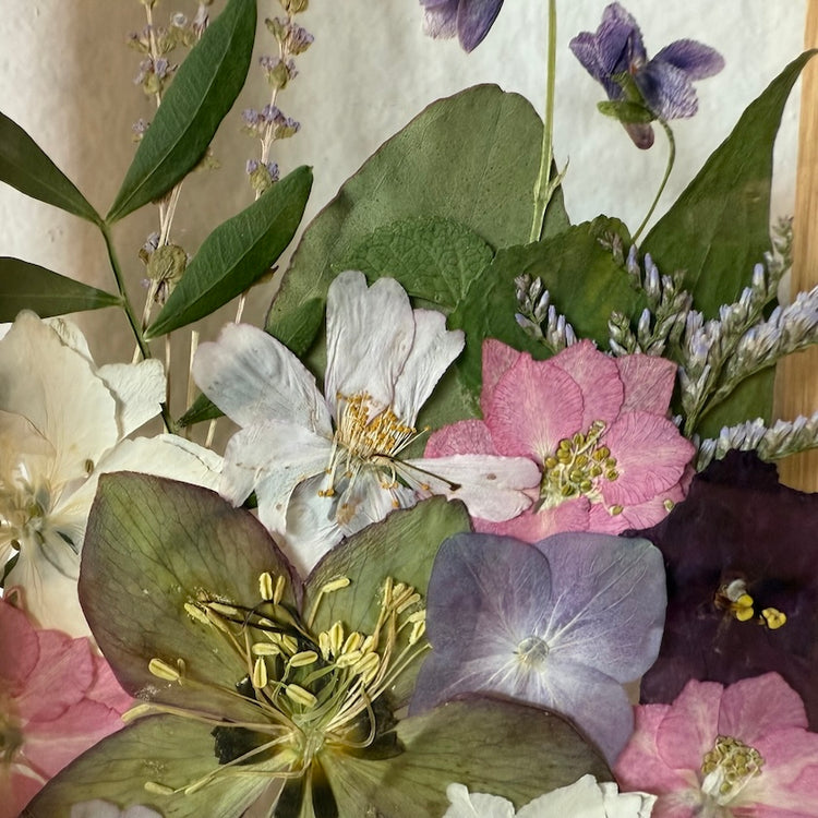Handgefertigtes Blumengemälde mit Blumen in Rosa, Rot und Weiß, die aus der Unterseite des Gemäldes wachsen. Unter den Blumen finden Sie Primeln, Wolfsmilch und andere.