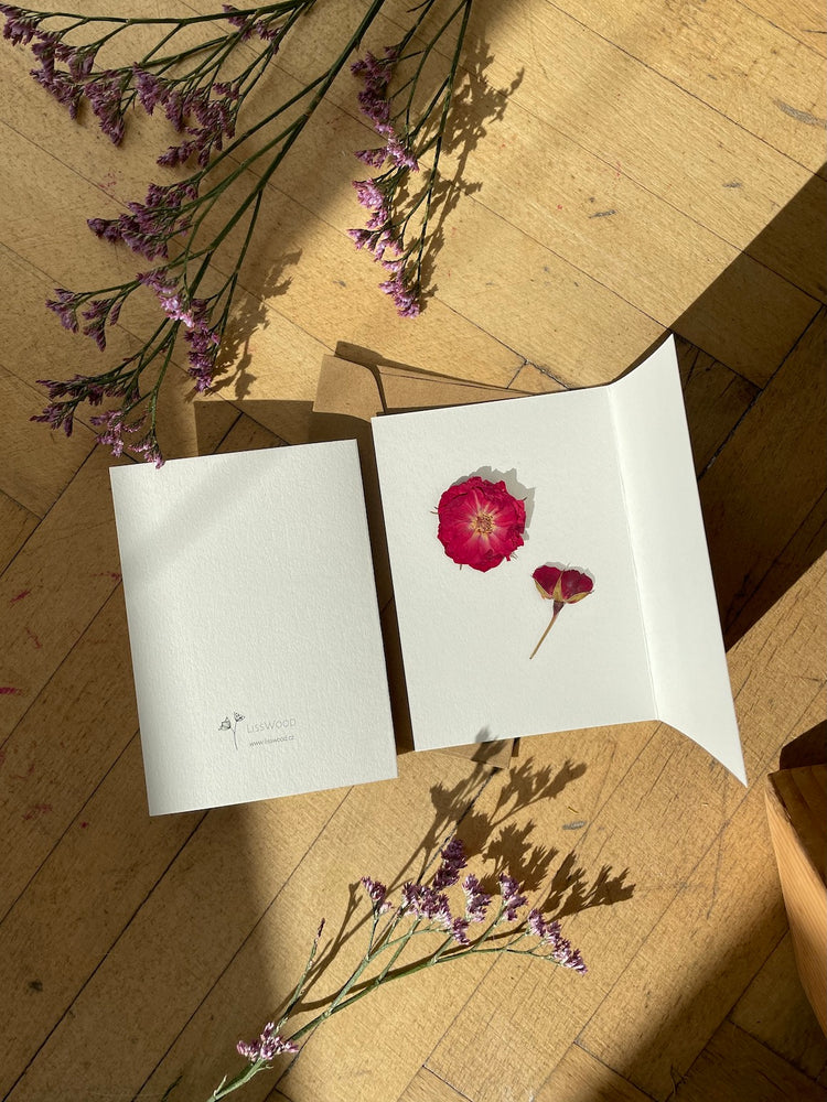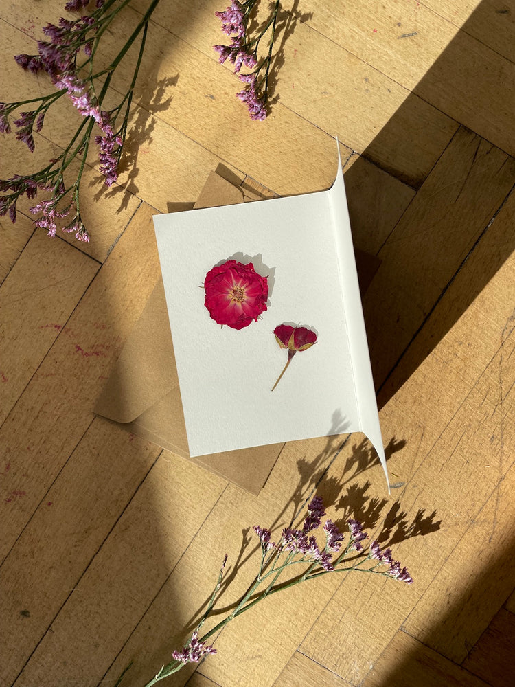 Erfreuen Sie Ihre Lieben mit einer Blumenkarte mit einer echten gepressten Rose und ihrer Knospe, die in einer Karte aus natürlichem Hartpapier platziert ist. Sowohl die vordere als auch die hintere Hälfte der Karte sind klar, um eine herzliche Nachricht zu schreiben. Verschenken Sie es mit einem Gemälde oder so wie es ist. ❤️