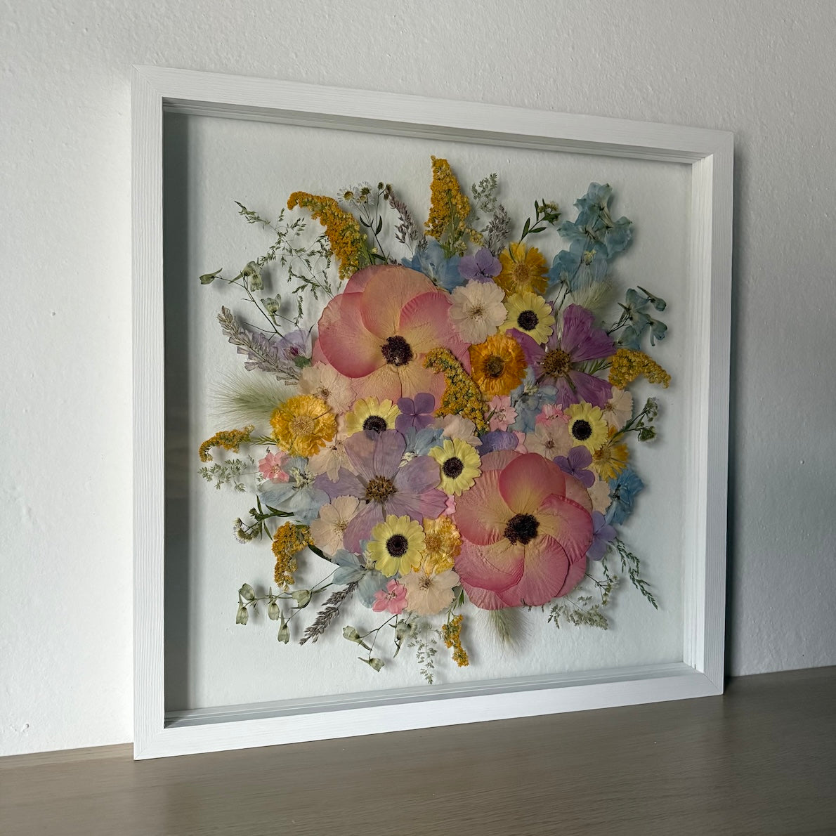 Genau das zeichnen unsere Gemälde aus. Wir legen Wert auf Originalität und Qualität, deshalb ist jedes unserer Gemälde ein Original, gefertigt aus echten, gepressten Blumen aus der Region und gefasst in handgefertigten Massivholzrahmen.