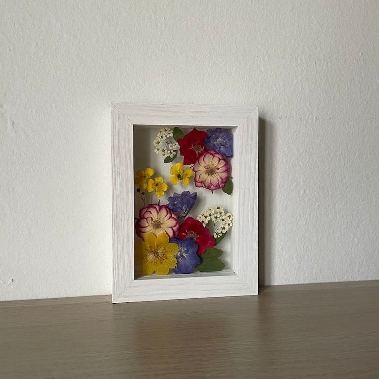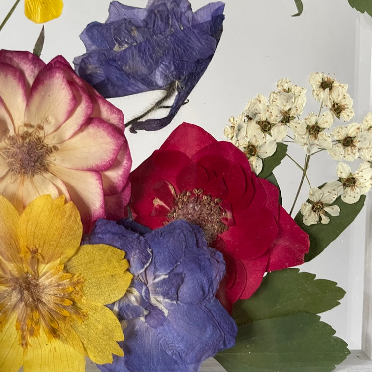 Handgemachtes Blumengemälde mit Blumen in Gelb, Blau und Weiß, die aus der Mitte des Gemäldes wachsen. Unter den Blumen finden Sie Sonnenblumen, Wolfsmilch und andere.