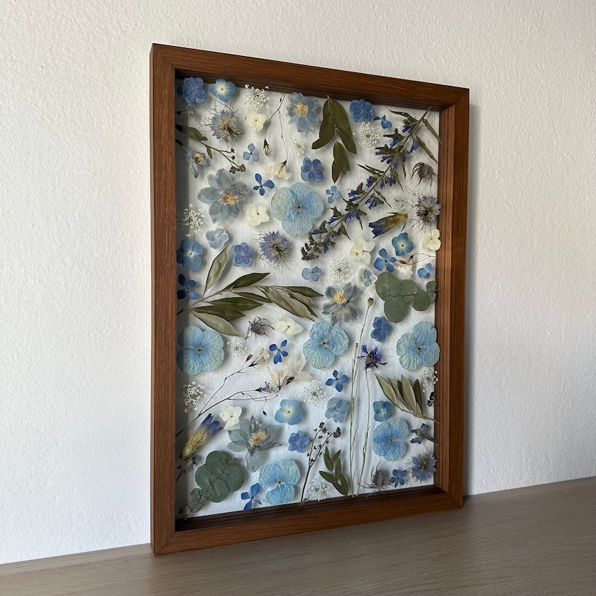 Handgemachtes Blumengemälde mit Blumen in Blau- und Weißtönen, die durch das gesamte Gemälde wachsen. Unter den Blumen finden Sie Hortensien, Krokusse, Stiefmütterchen und vieles mehr.