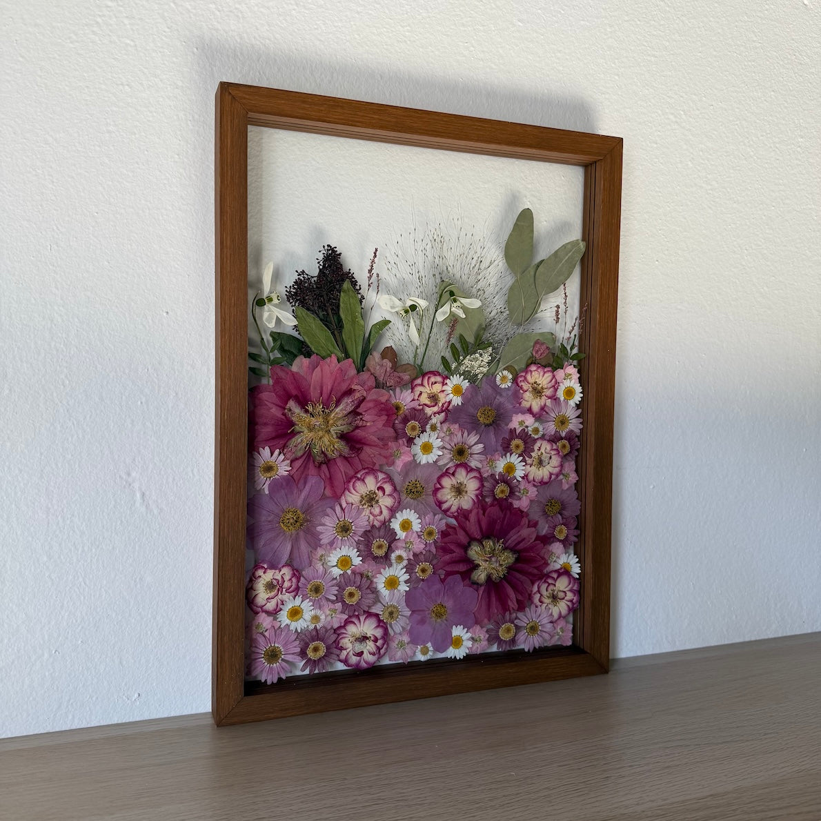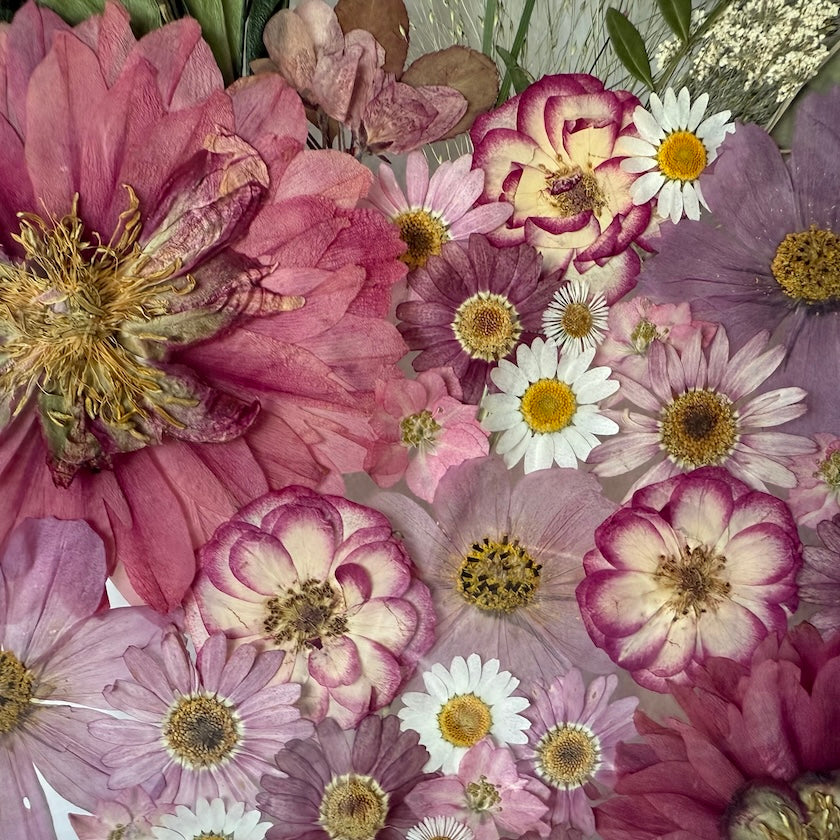 Handgefertigtes Blumengemälde mit Blumen in Rosa-, Burgunder- und Weißtönen, die aus der Unterseite des Gemäldes wachsen. Unter den Blumen finden Sie Rosen, Pfingstrosen, Margeriten, Gänseblümchen und vieles mehr.