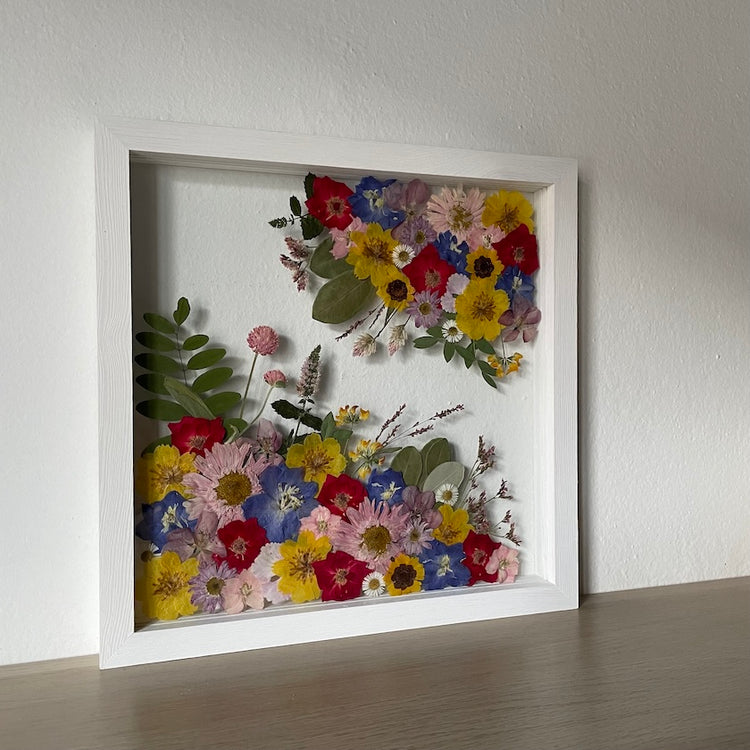 Handgemachtes Blumengemälde mit Blumen in Rosa, Rot und Weiß, die aus den Ecken des Gemäldes wachsen. Unter den Blumen finden Sie Schmucklilien, Rosen, Wolfsmilch und vieles mehr.