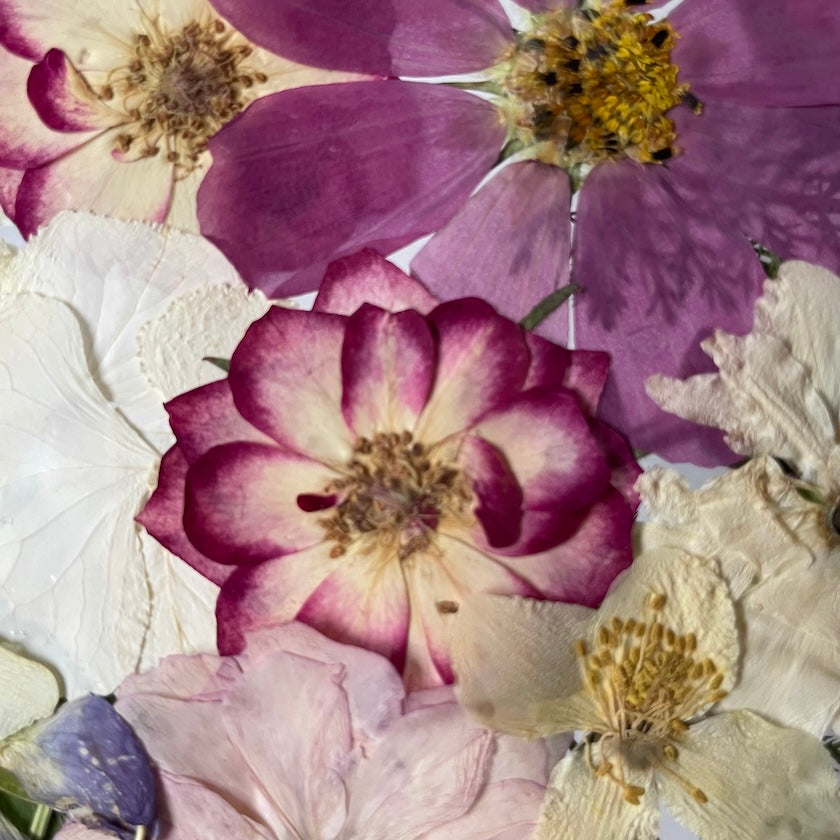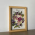 Handgemachtes Blumengemälde mit Blumen in Rosa, Lila und Weiß, die aus der Unterseite des Gemäldes wachsen. Unter den Blumen finden Sie Krokusse, Gänseblümchen, Rosen und vieles mehr.