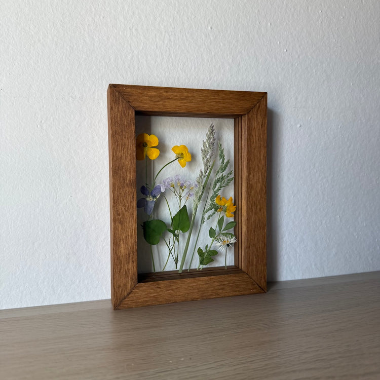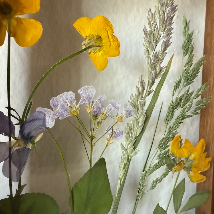 Ein handgefertigtes Blumenwiesengemälde mit Blumen in Gelb, Blau und Weiß, die aus der Unterseite des Gemäldes wachsen. Unter den Blumen finden Sie Gänseblümchen, Kornblumen und andere.